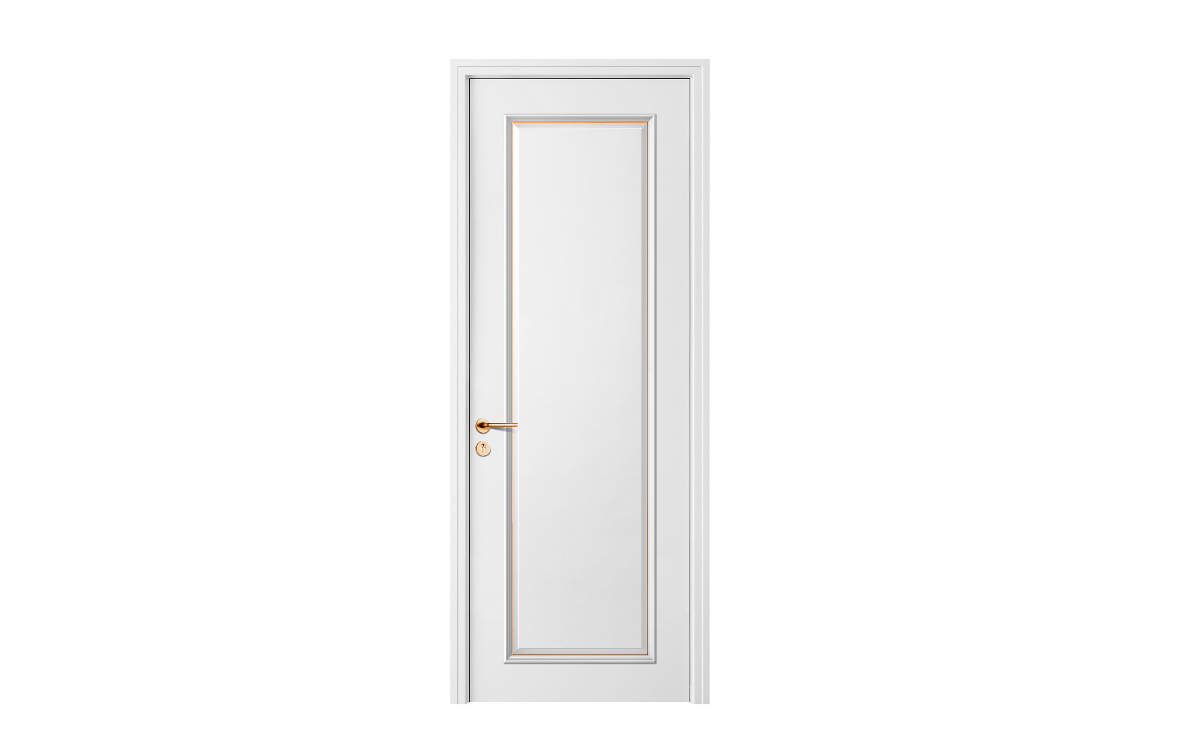 宋代诗人苏轼《洞仙歌.咏柳》中将柳喻作金丝,并言:细腰肢自有入格风流,仍更是、骨体清英雅秀。谁见金丝弄晴昼?”设计师有感而发,采用门板混油技术,选用纯白色油漆覆盖木质本色,散发着纯粹光洁的晶莹光泽,仿若白光耀眼的郎朗晴空;中间配以镶板压线设计,四周环绕玫瑰金线以做点缀,二者交相辉映,清英雅秀。