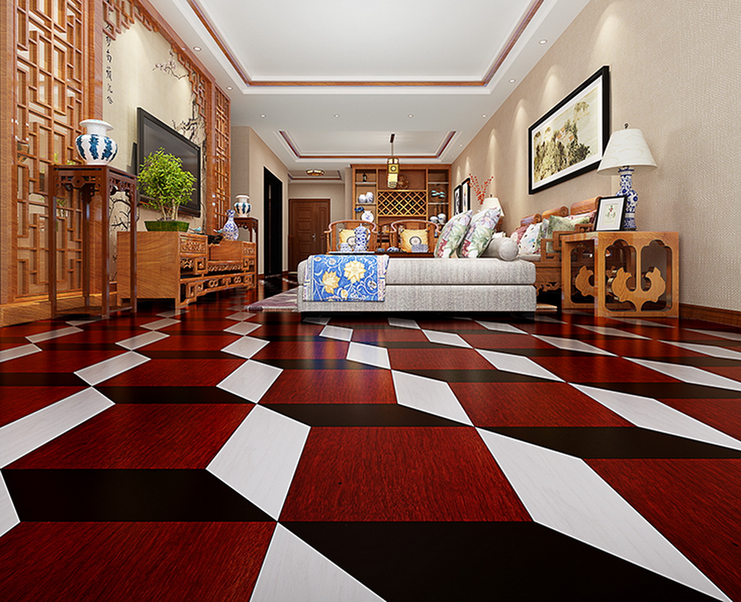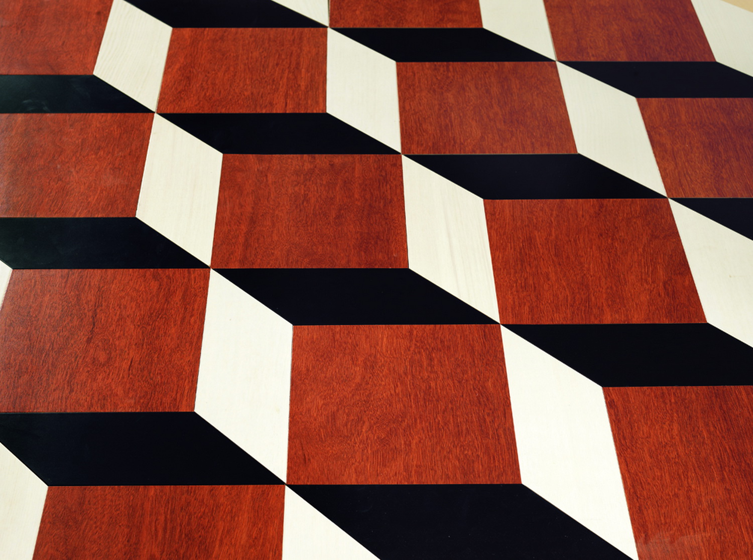活字印刷术,是中国伟大的四大发明之一。北宋时期,毕昇改良隋朝的雕版印刷,开创世界活字印刷之先河。此款拼花地板运用创新的空间立体设计,以三种色块的巧妙组合,呈现字模有序排列之状。